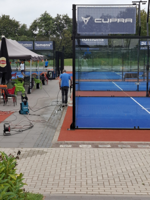 Maar is er een incidentele klus, zoals bijvoorbeeld het vervangen van een lamp op de padelbanen, wordt er iemand van de AC opgetrommeld en ‘met gevaar voor eigen leven’ wordt de lamp vervangen. Steiger wordt bij de buren geleend en het klusje wordt geklaard.