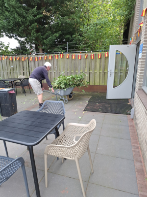 Elke eerste donderdag van de maand wordt dit bijgehouden door 18 (!) vrijwilligers. Tijd om hier eens bij stil te staan. Denk aan zaken als het doorspoelen van de douches (ivm legionella), het water geven van de bloembakken, de nieuwe bomen vragen zo’n 80 liter per jaar!, het onkruid verwijderen, vegen van het terras en de trappen, het zwerfaval opruimen, grasstroken maaien, snoeien en zo meer. Als je zelf een tuin hebt, weet je er alles van en ook hoeveel werk er in gaat steken. En dan hebben we het nu alleen even over de maandelijkse werkzaamheden, maar het jaarlijstje liegt er ook niet om. Te denken valt hierbij aan: een ventilator in de buitenbar, een kabel trekken door mantelbuizen van de machinekamer Blaashal naar een alarmkastje in het magazijn achter de keuken voor alarm bij gebruik diesel (?), lampen monteren bij de tennismuur, het opnieuw kitten van de lekbakken onder de tapinstallatie. Gedacht wordt ook nog aan klapdeurtjes bij de ingang van de bar. De lijst is te lang om hier te benoemen. Iedereen maand wordt een lijstje gemaakt en de taken verdeeld. Met veel enthousiasme gaan ze allemaal te werk. Om half elf wordt er een halfuurtje koffie gedronken, niet langer, want er is altijd veel te doen.