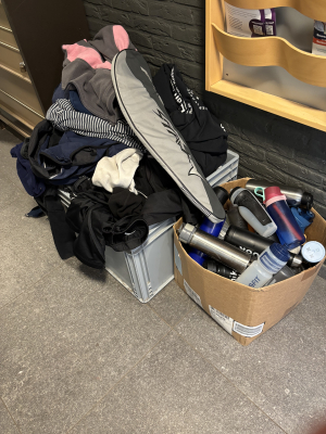 Jassen, schoenen, tenniskleding, bidons, al deze gevonden voorwerpen liggen in een grote plastic bak in de hal tegenover de toiletten.